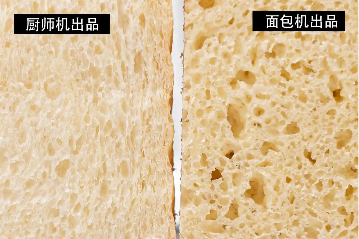 ▼体现在面包的出品上就是如下的情况,厨师机出品的面包柔软、组织细腻、表皮很薄,而面包机出品的内部空虚,同时由于面包机的空间有限,表皮加热温度高,外皮也厚而硬,外皮厚这一点,外资内资的面包机都没法解决。