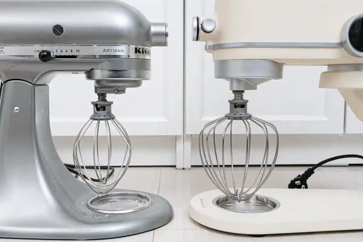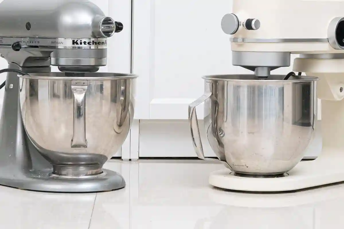▼两者的搅拌盆都是5L左右的容积,都采用不锈钢材质并配有把手,设计非常类似,ka盆顶较尖,大宇盆底较平。