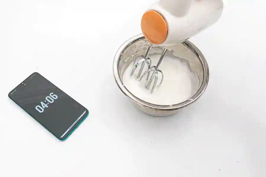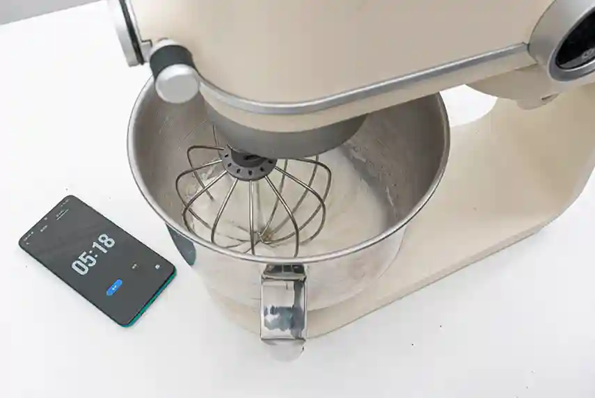 ▼打到硬性发泡状态,大宇厨师机用时7分钟,手持电动打蛋器用时9分钟,虽然看着时间上差2分钟,但是一个是自动运行,一个是手持不停画圈的,谁累谁轻松不言自明。