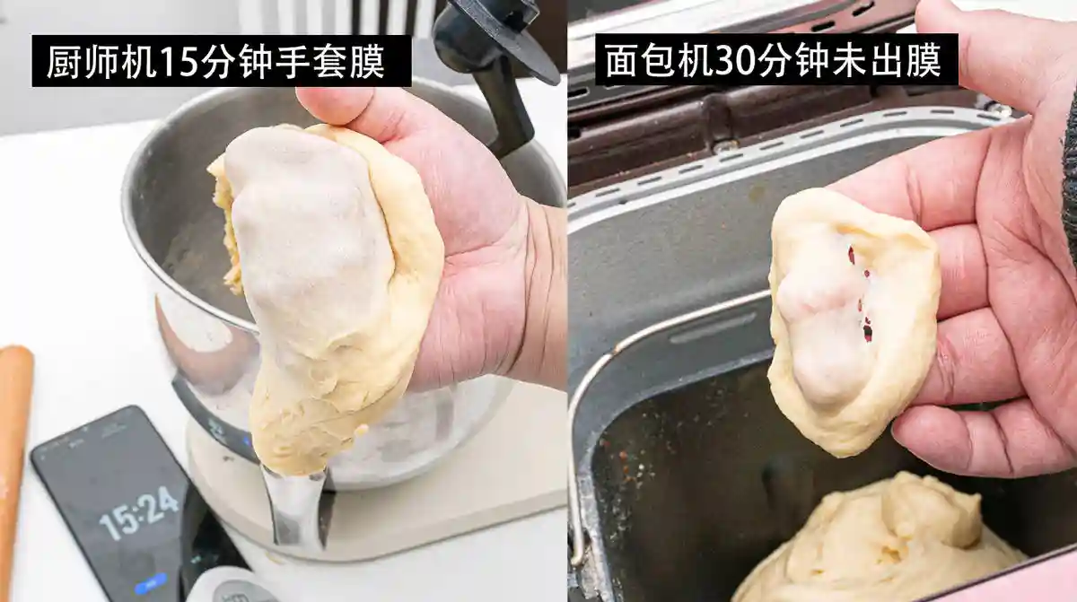 ▼最终在出膜时间上就形成了巨大的差异,以我目前在用的大宇厨师机为例,要达到手套膜的状态,大宇厨师机用时在15分钟,而面包机自带的揉面程序最大只能进行30分钟的揉面,在30分钟揉面后,面包机只能出比较脆弱的厚膜,完全达不到像厨师机手套膜那样大面积坚韧薄膜。