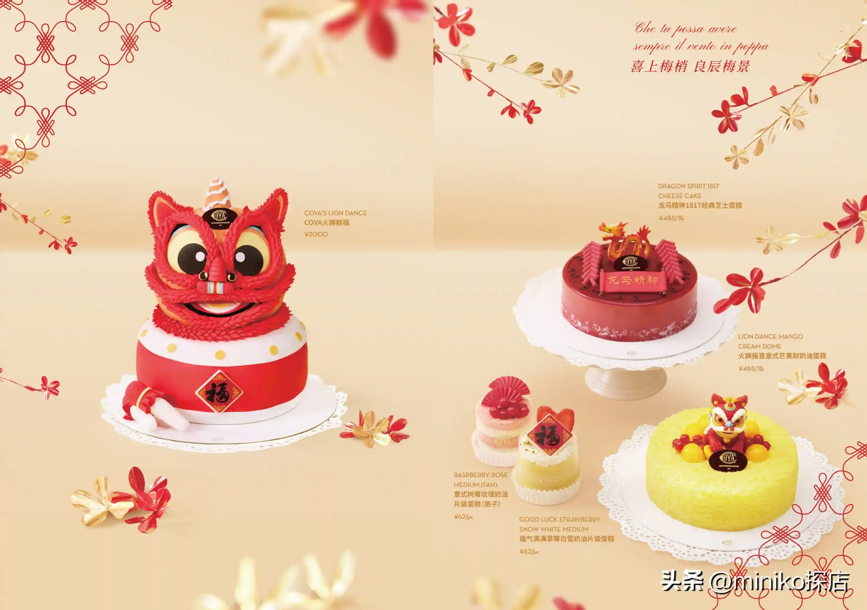 岁未梅舞踏歌,龙腾展翅,龙年即将来临之际,COVA以中国传统新年元素为灵感创意呈献春节系列,甜蜜预祝新春大吉,万事如意。COVA甜点师一直坚持融汇传统和创新,匠心独运地实践传承两百多年的配方,不断制作备受喜爱的限定产品。此次COVA以舞狮、龙、春联、炮竹及全盒等中国传统新年元素为灵感,精巧打造春节系列3D蛋糕、磅数蛋糕和糕点,以精美中式造型和非凡美味开启团圆佳节