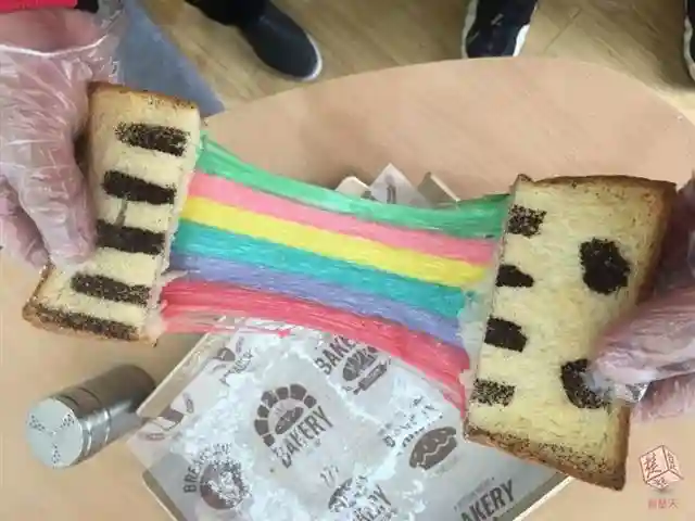 18日下午,在街道口未来城二楼的吾后欧包店内,一位女生双手拿着一块方形的吐司分别向两边拉开,吐司中间慢慢露出一块由红、黄、蓝、绿等几种颜色组成的长条形“内馅”。看到自己越拉越长的“奇观”,女生开心地直呼“好玩”。