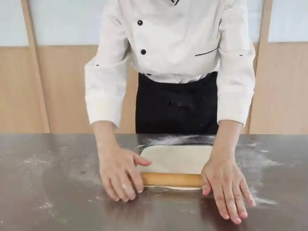 将水油面包裹干油酥后,用手压扁再用擀面杖擀成长方形且厚薄均匀的薄面皮。