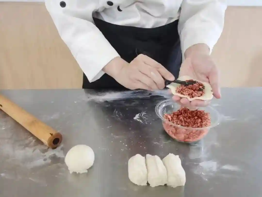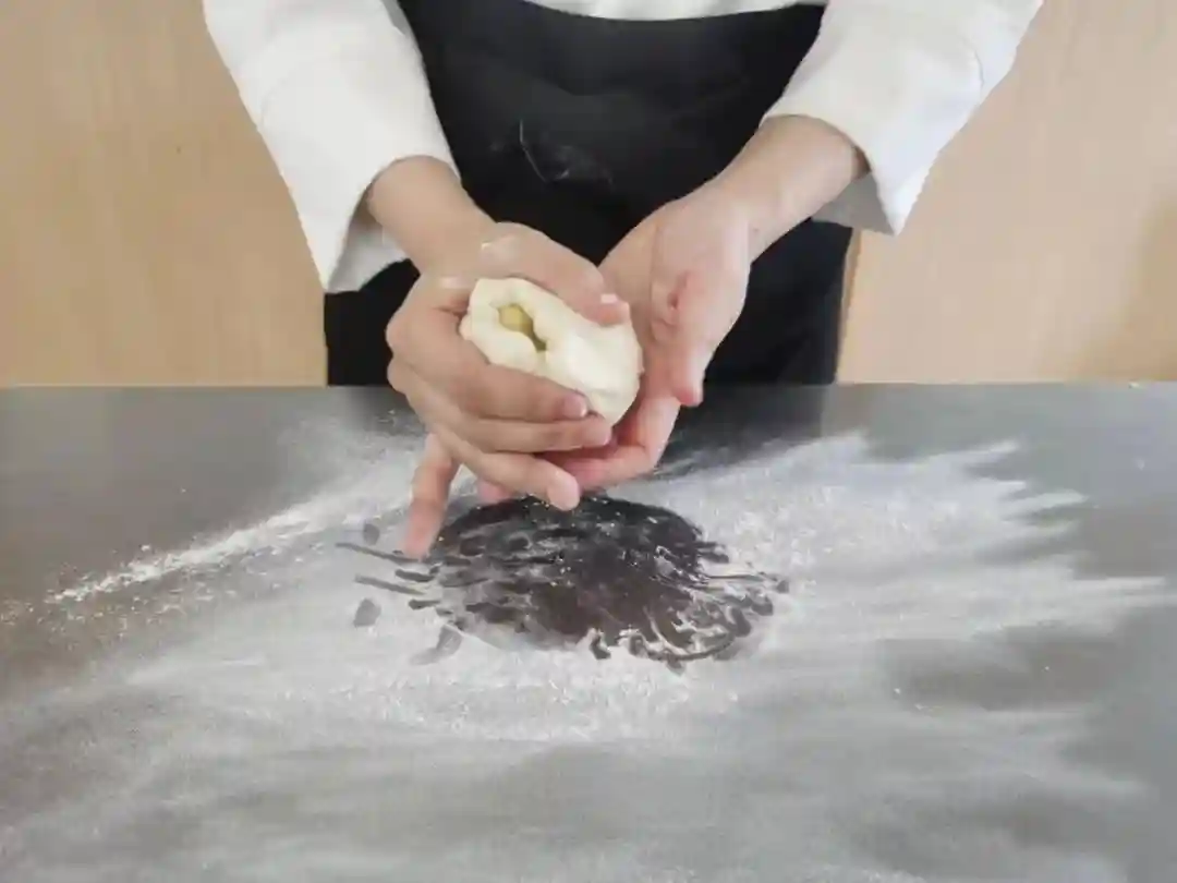 在面皮中间填入馅料后,揉成圆球状,收口朝下立于桌子上。包制时尽可能多填些馅料,这样制作出的鲜肉月饼口感会更加鲜香。