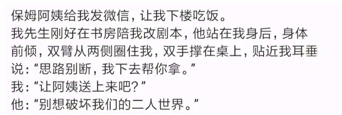 潇湘晨报:我看您今天发的那条,您说保姆叫您下楼吃饭,您先生在陪您改剧本,他站在您身后,双臂从两侧圈住你,贴近您耳垂说“思路别断,我帮你下去拿”,这样的细节是真的吗?