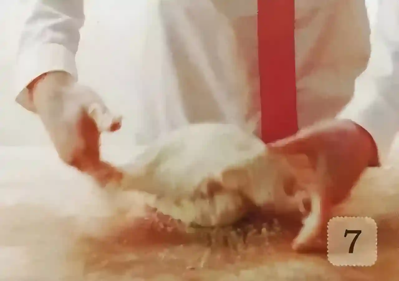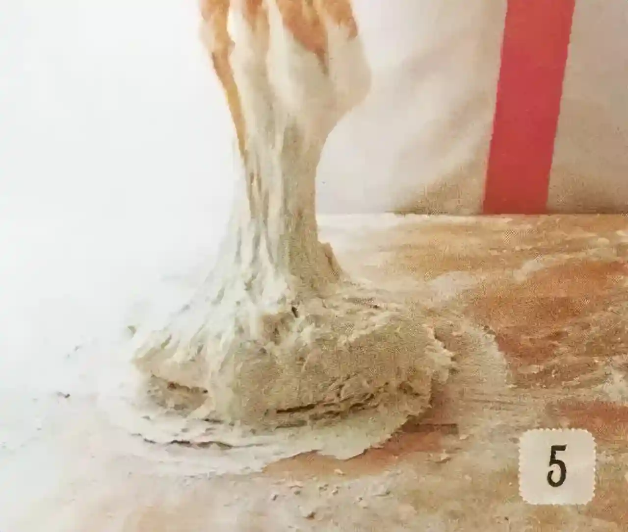 ④翻折后的面团用手用力压平并揉和后,重复步骤②③④一拉扯二翻折三揉压这三个步骤,直至面团变得柔软平滑。