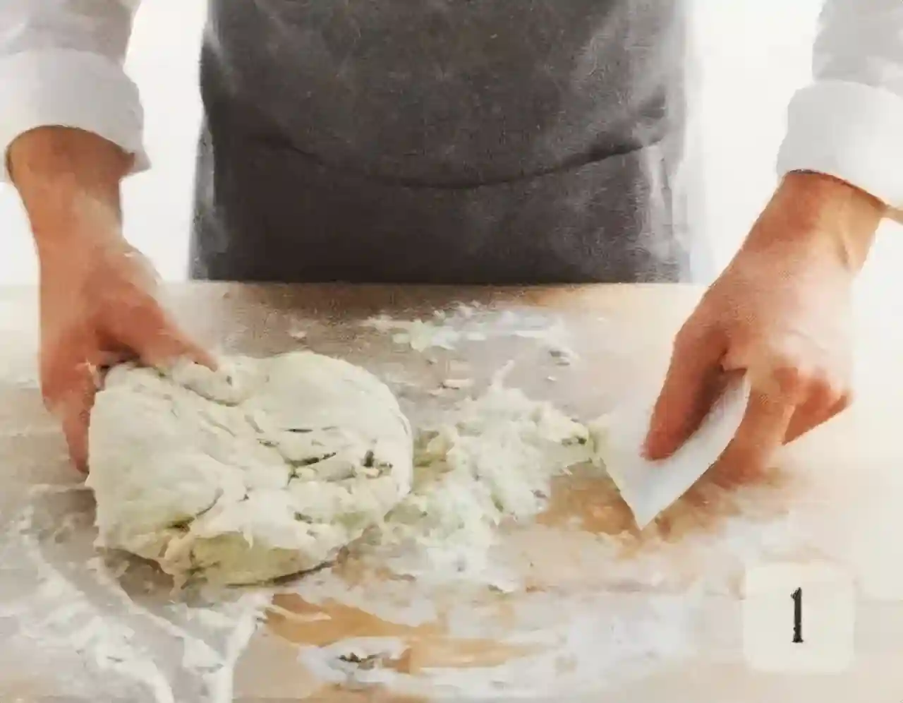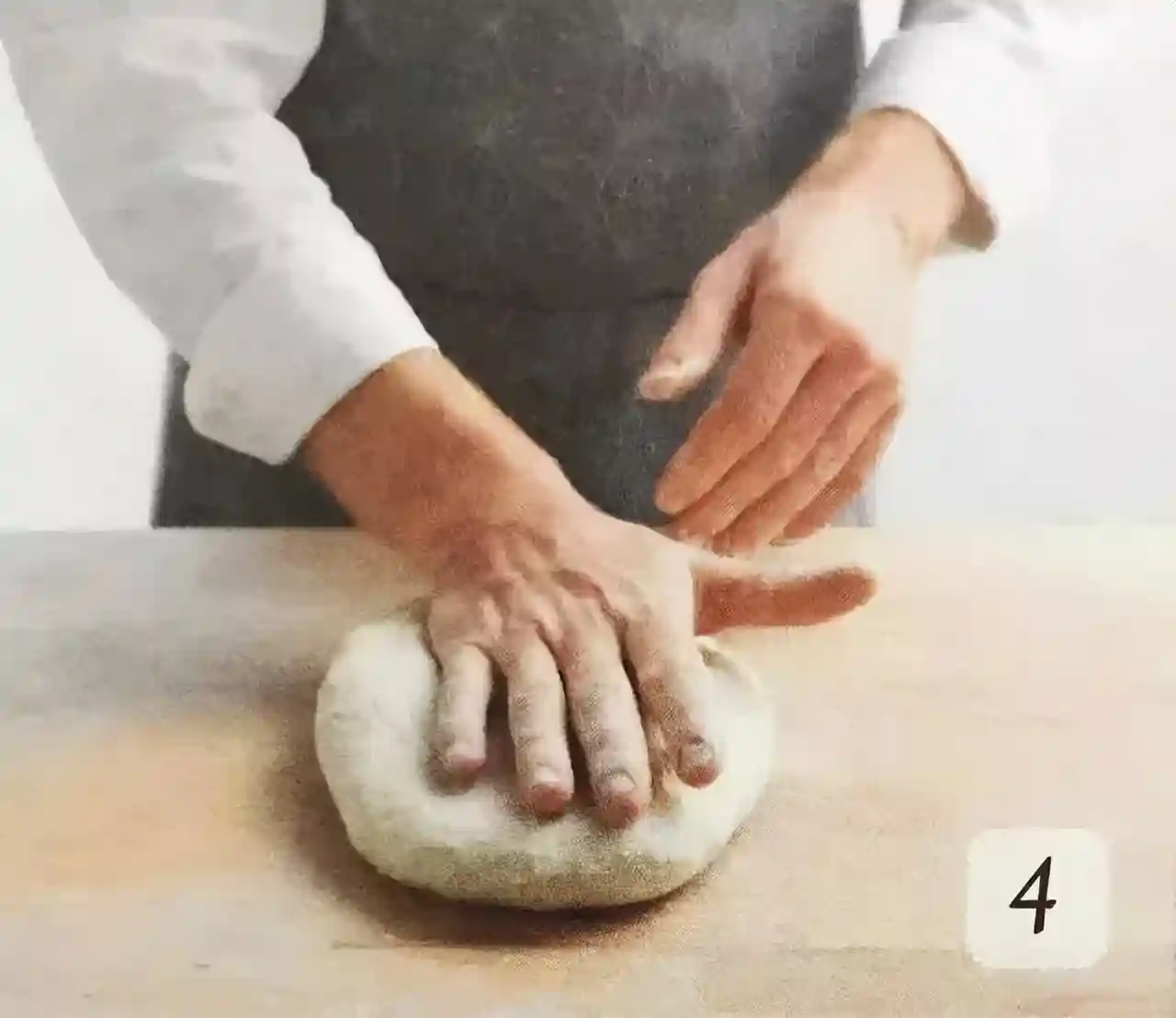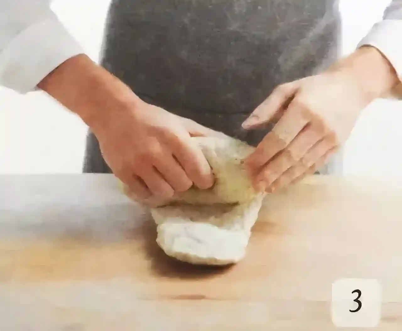 ③将面团翻折一或两次,使之聚拢折叠在一起。