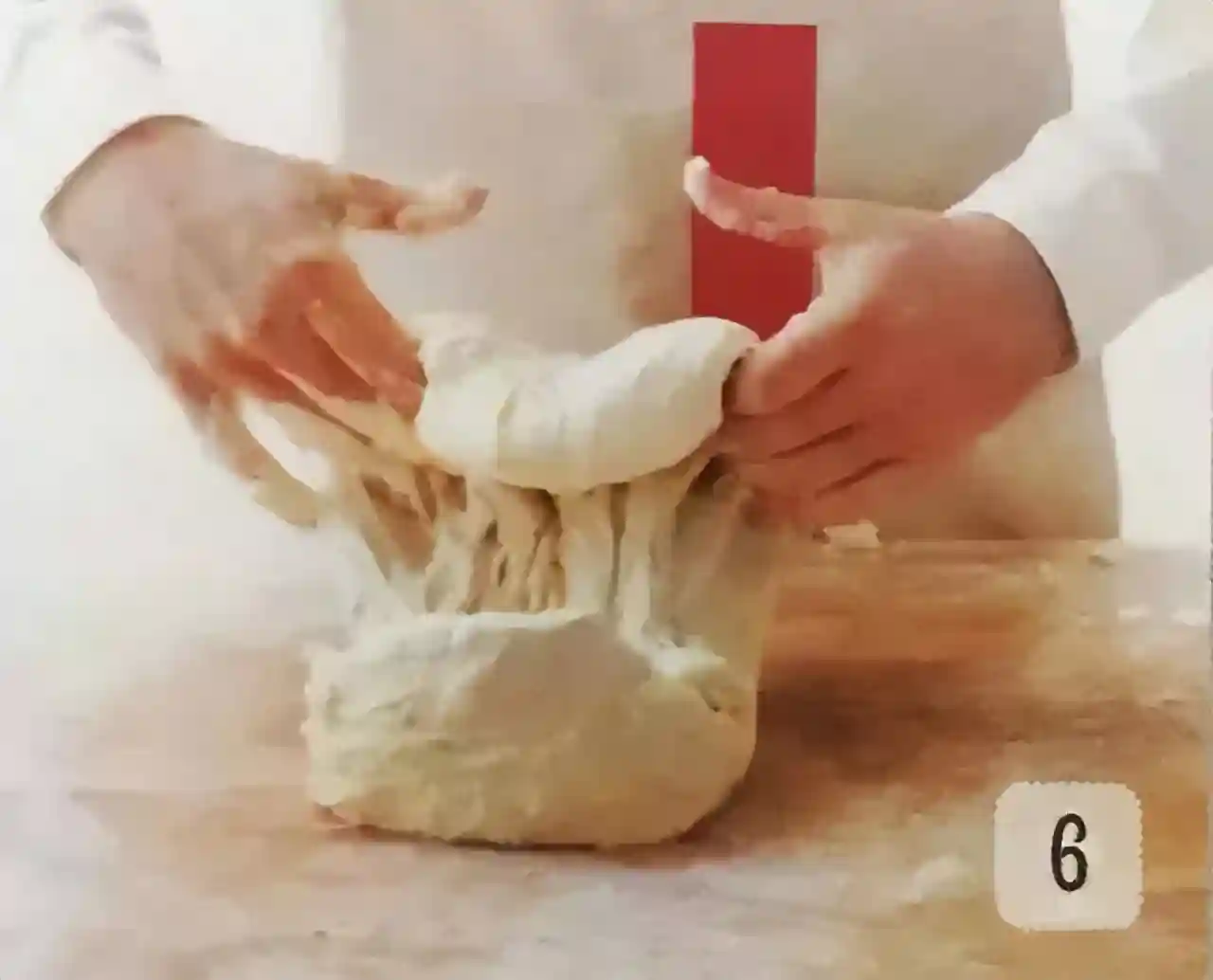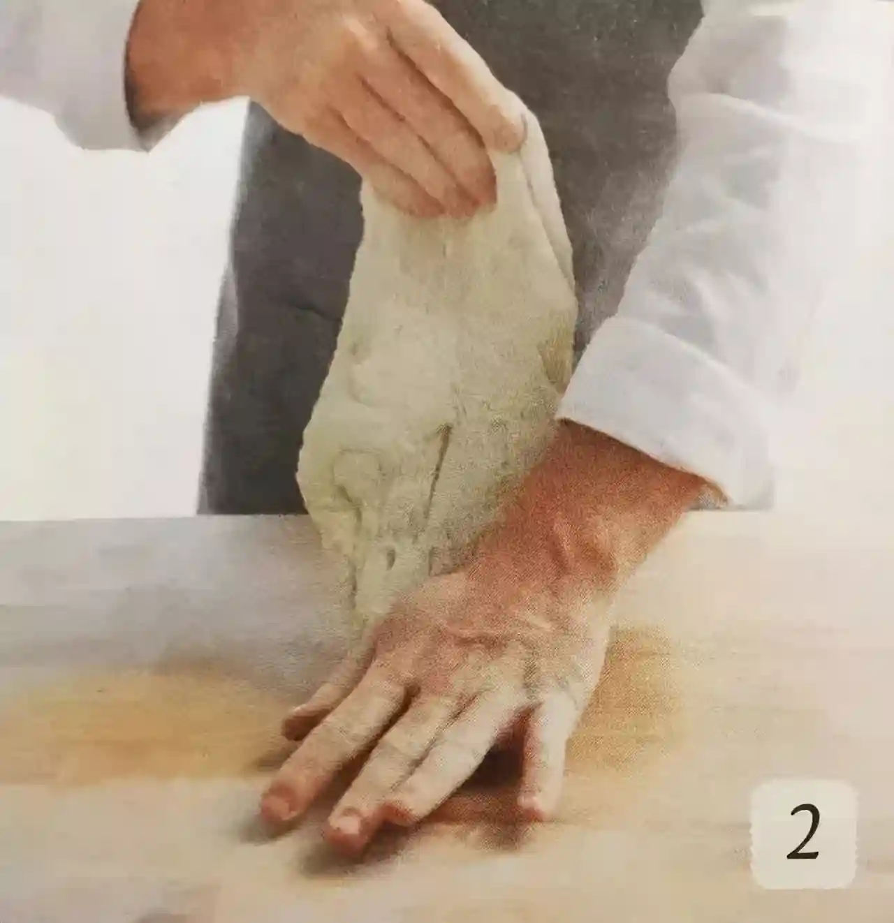 ⑥用两只手将面团抓起,使面团与工作台分离,避免面团与工作台黏在一起。