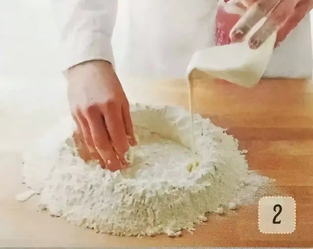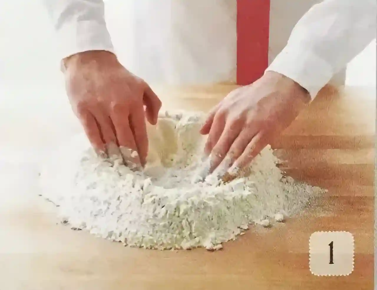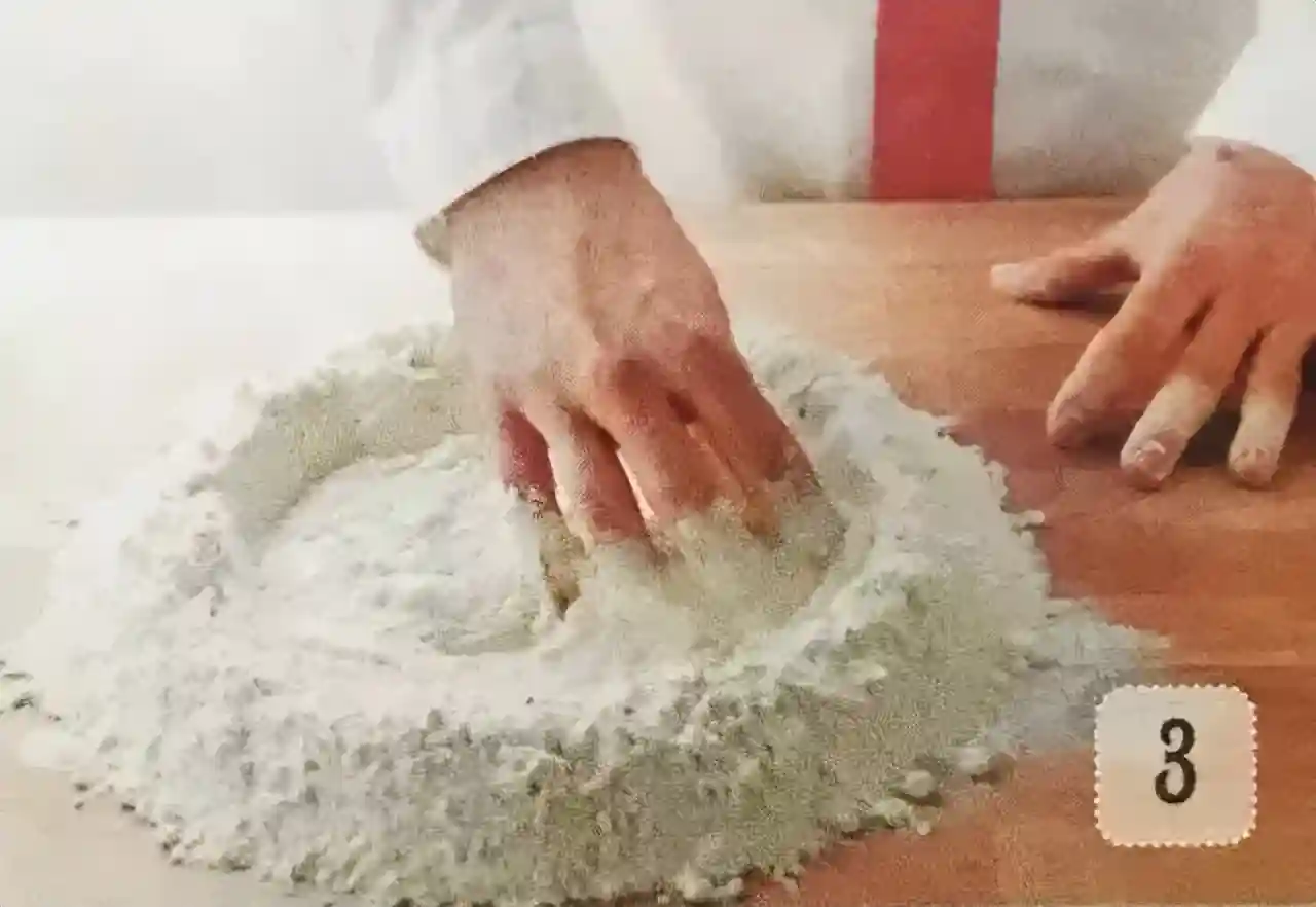 ①把面粉倒在工作台上,围成一个凹字形的深井状。