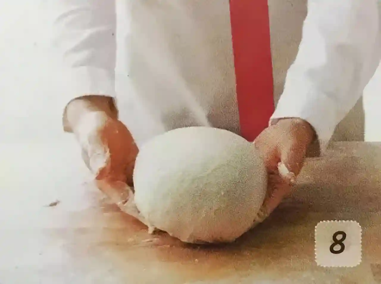 ⑧用手拉起面团的两端,直到能形成薄膜后,将面团卷起并收拢成圆球状即完成。