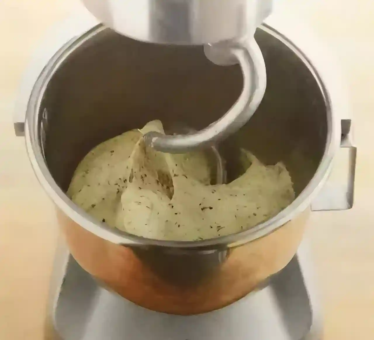 记得时不时要将附在锅壁的面粉刮入锅内,使得所有面粉能够充分均匀揉和。