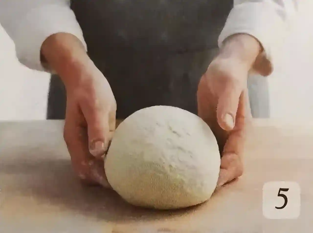 ⑤揉和完成后,将面团收拢卷成圆球形即完成揉面过程。