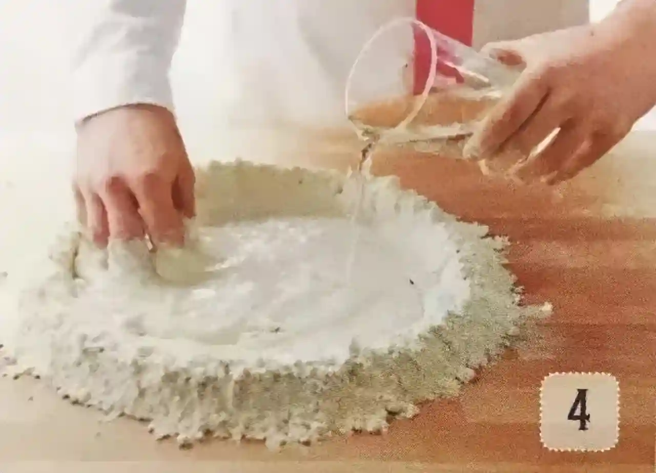 ④另一只手则慢慢地把周围的面粉推入面粉堆井中,井堆越和越大,井内面粉糊会越来越稠,加入盐和剩余的水。
