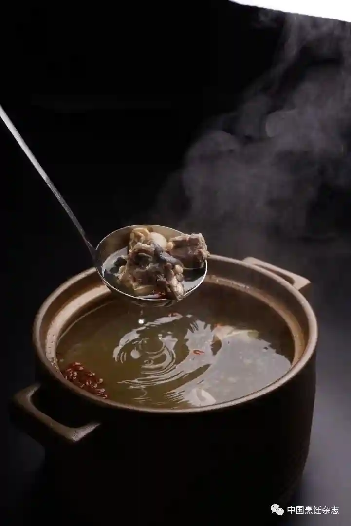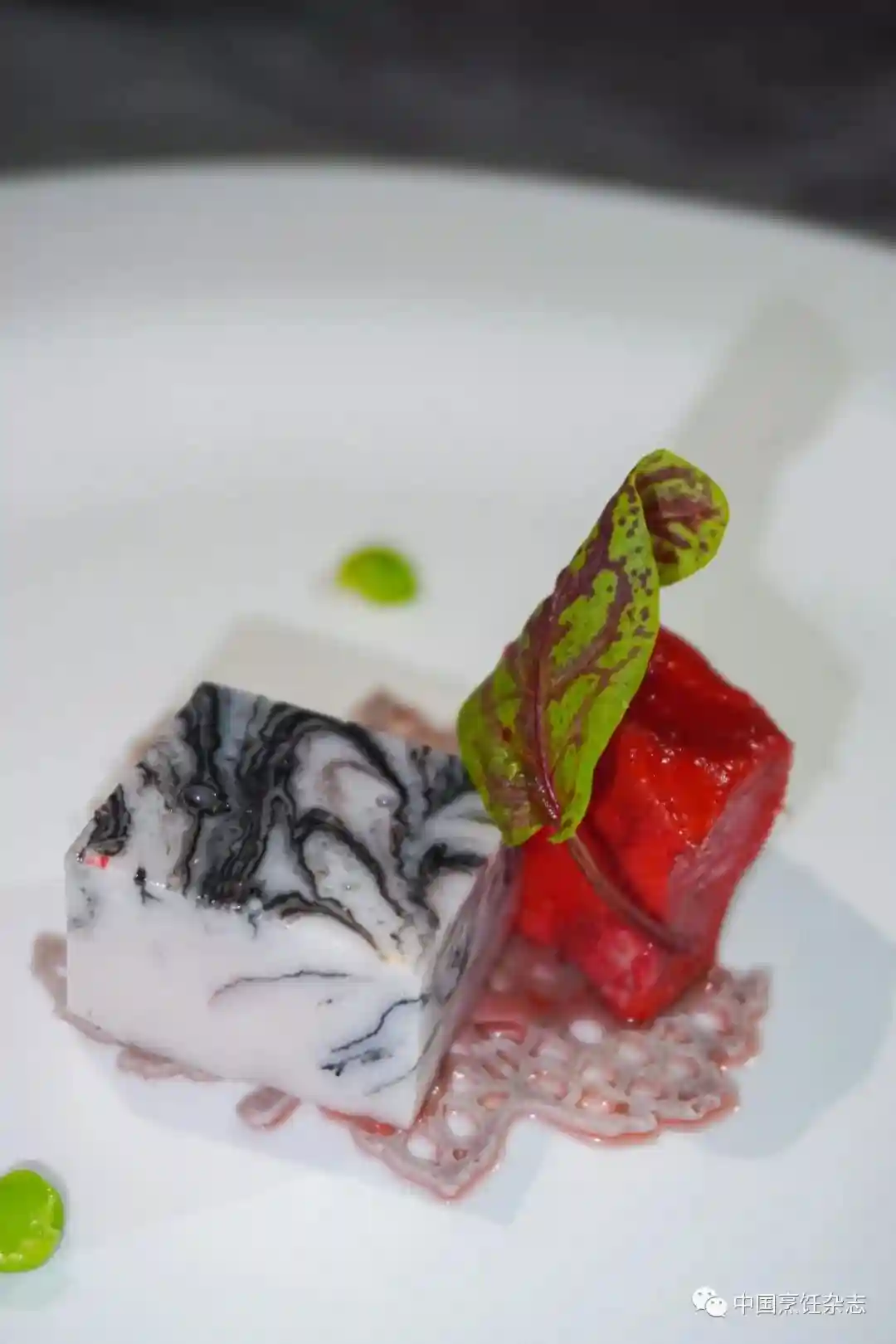 在11月22日的小雪·时晴宴中,贺俊贤寻味湘西,以澧水中游慈利县文化及食材为主题,运用新派手法呈现当地美馔。素有“金慈银澧”之称的慈利是大理石之乡,贺俊贤及其厨师团队以此为灵感,采用香芋仿制出具有大理石花纹与形状的糕点,以特色香槟裹鹅肝为辅,首道“香槟鹅肝·大理石糕”鲜明点出地域特质。澧水中游的江垭峡谷水质无污染,富含硒元素,养殖于此的鳙鱼已成为江垭地标特产,他们取材制作出“拆烩江垭峡谷鳙鱼头”,将鲜活鳙鱼剔骨去刺,淋入提前熬制的鲫鱼高汤,令鱼头更加鲜甜,汤底味道更加浓厚。