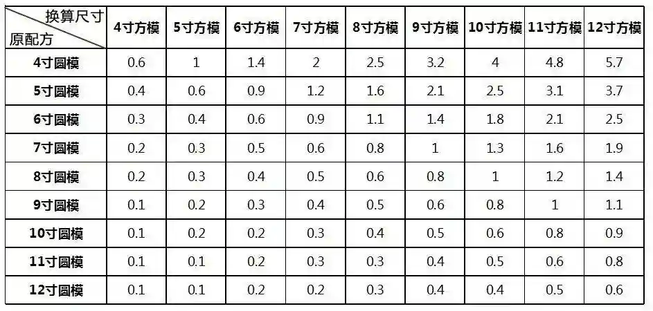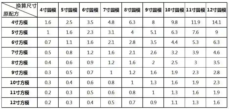 其实按照公式计算下来,方形模具换算表格,与圆形模具相同,感兴趣的小伙伴可以自己手动计算下哈