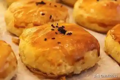 将油酥包入水油面中折叠檊制两次(同前法),第三次檊成长方形厚度0.6—0.8厘米(不加芝麻),将面皮卷成长棒形然后分成60克一块,小块面缝口向上展成片状包入馅料后檊成圆饼状摆入烤盘(注意:一定不要漏馅)。烤箱温度240℃,烤12分钟。