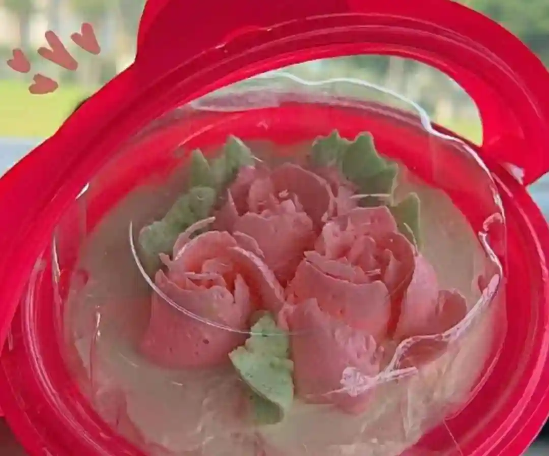 玫红色的塑料外壳里装着白花花的奶油,奶油上方是粉色奶油制作成的几朵小花,花朵与花朵之间还有几片绿色的叶子。