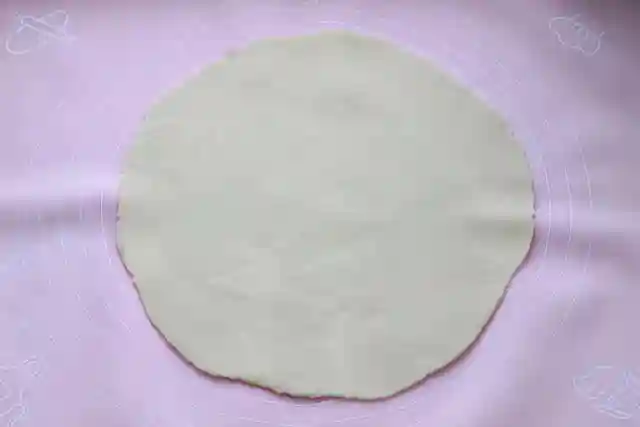 6.取出冷藏好的面团用擀面杖擀成比派盘大一圈的面片,我用的派盘是八寸的菊花派盘。