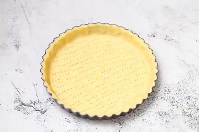 7.将面片盖到派盘上,轻轻按压四周使派皮与边缘贴合,用擀面杖在排盘边沿上来回擀压,扯去多余的派皮,中间用叉子扎一些小眼儿,防止烤制过程中派皮鼓包。