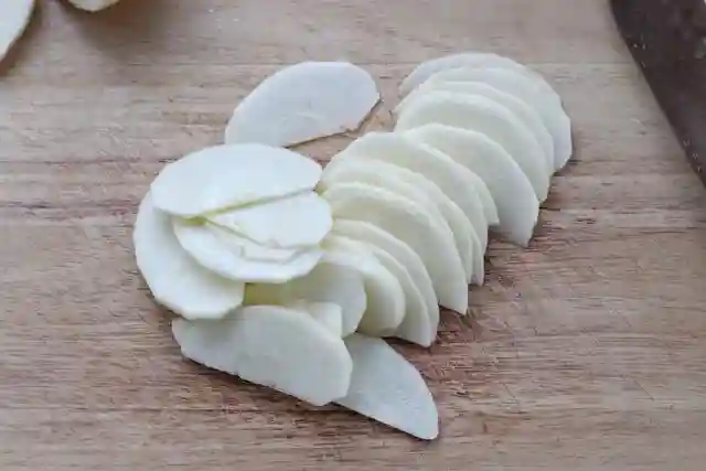 8.苹果洗净去皮,切成大小、薄厚尽量一致的片状。