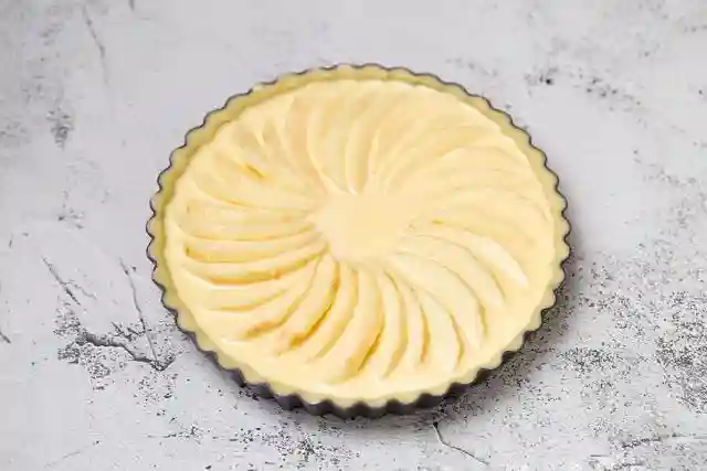 9.将苹果片整齐地摆放进派盘中,再倒入调好的派馅。