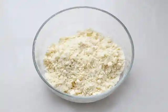 2.用手抓起面粉揉搓,直到面粉与黄油彻底融合呈粗砂粒状态。一开始黄油还比较硬,随着手的温度就会慢慢软化了,所以要有点耐心。