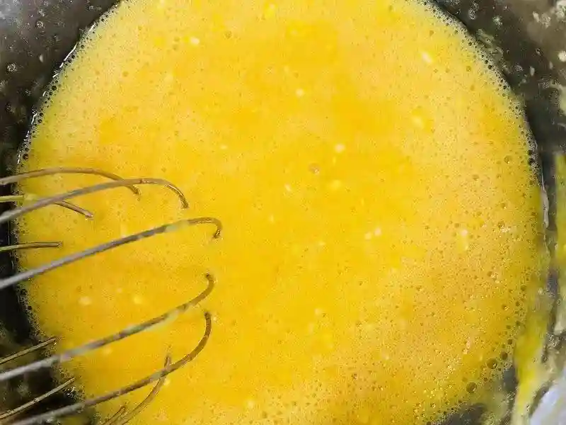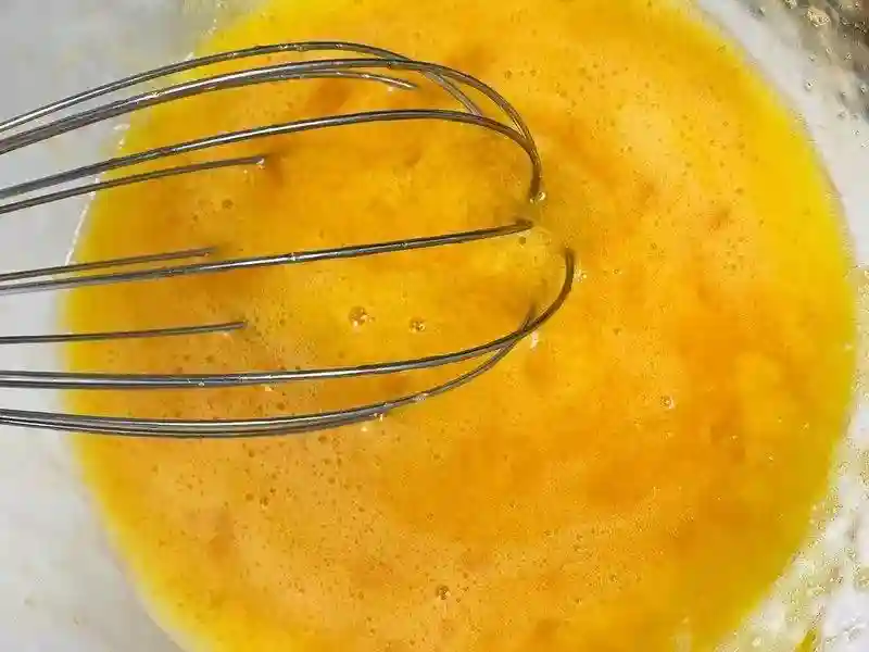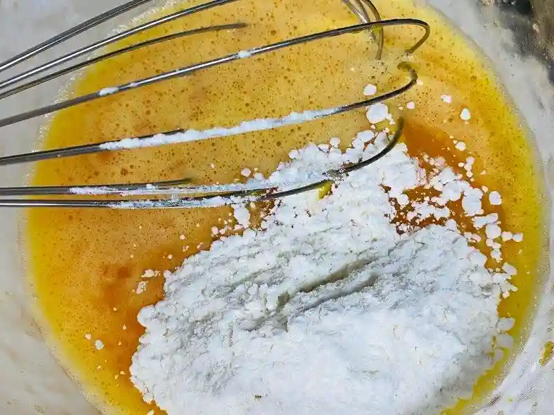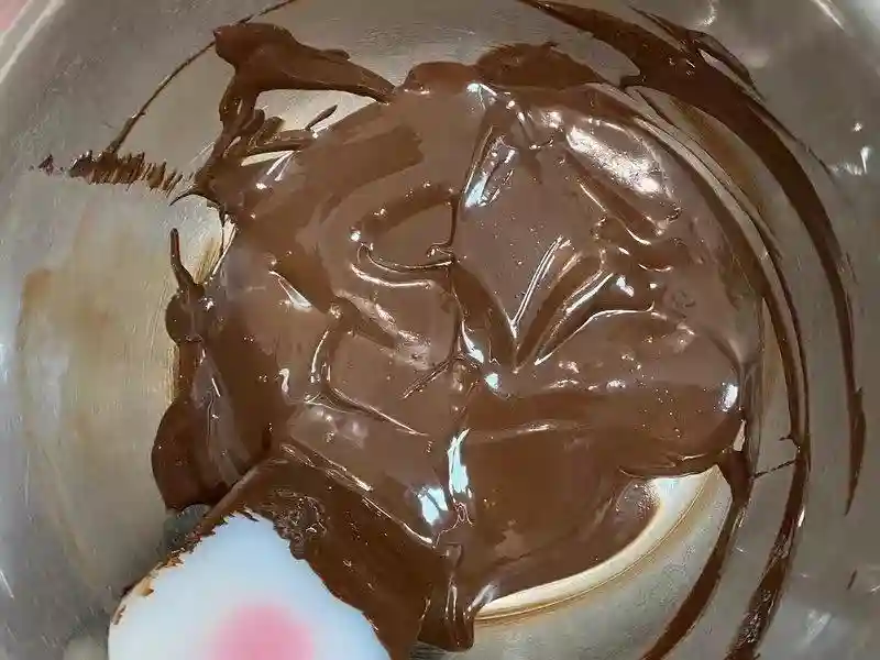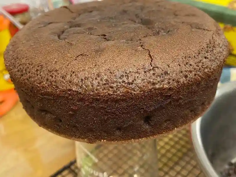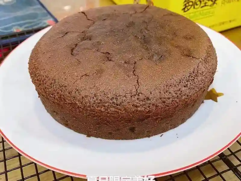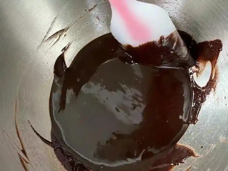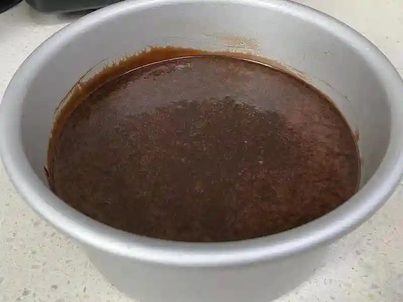 7/将巧克力液与鸡蛋糊混合搅拌均匀,过一遍筛,倒入6寸模具中,轻震刮平,放入提前预热好的烤箱内,185°烤制20分钟。