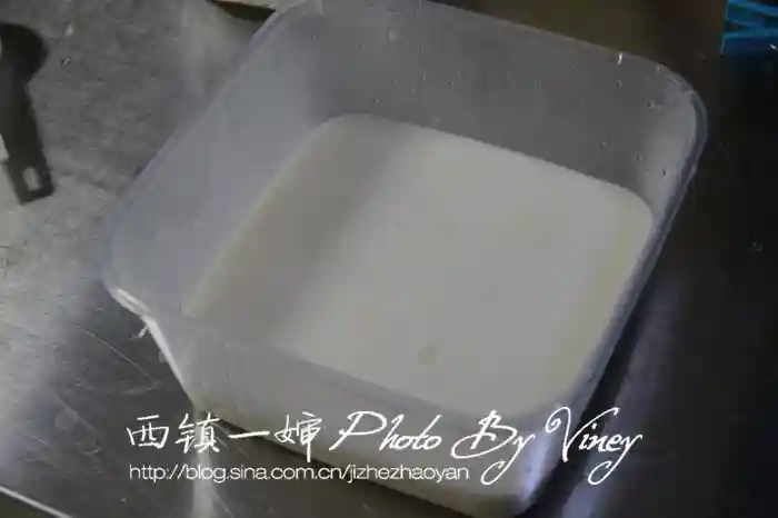 4、煮好的杏仁牛奶浆倒入平底容器中,晾凉后盖好盖子,放入冰箱冷藏至凝固即可。