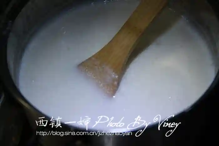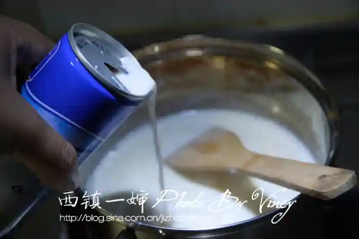 3、然后再倒入整罐的杏仁露,还有剩下的牛奶,细砂糖,继续加热,不停搅拌。煮至糖溶化即可。
