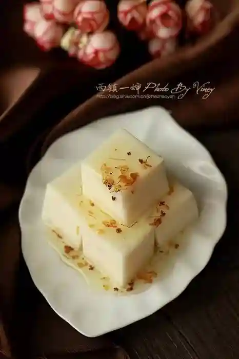 作为传统名点之一的杏仁豆腐,其实属于甜点,主要是用甜杏仁磨浆后加水煮沸,待冷冻凝结之后切块而成,因形似豆腐而得名。