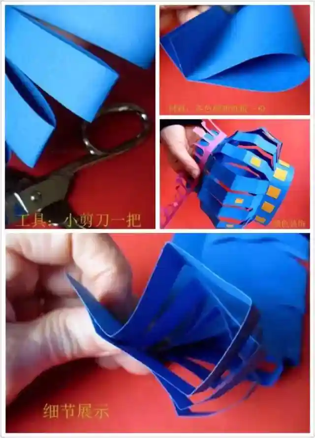 这个做法也简单,直接将纸卷成圆筒,上下各用一条稍厚的纸条做固定,圆筒上可以自己做装饰,贴上亚克力的彩钻,效果很漂亮。小提示:灯笼纸应该选择透光好的纸张,比如宣纸或者棉纸。