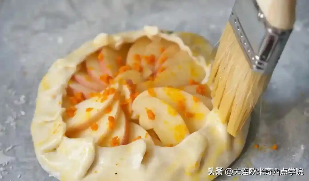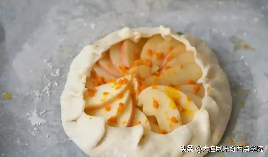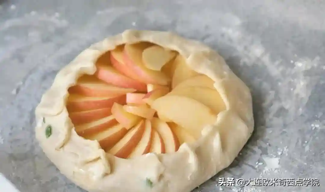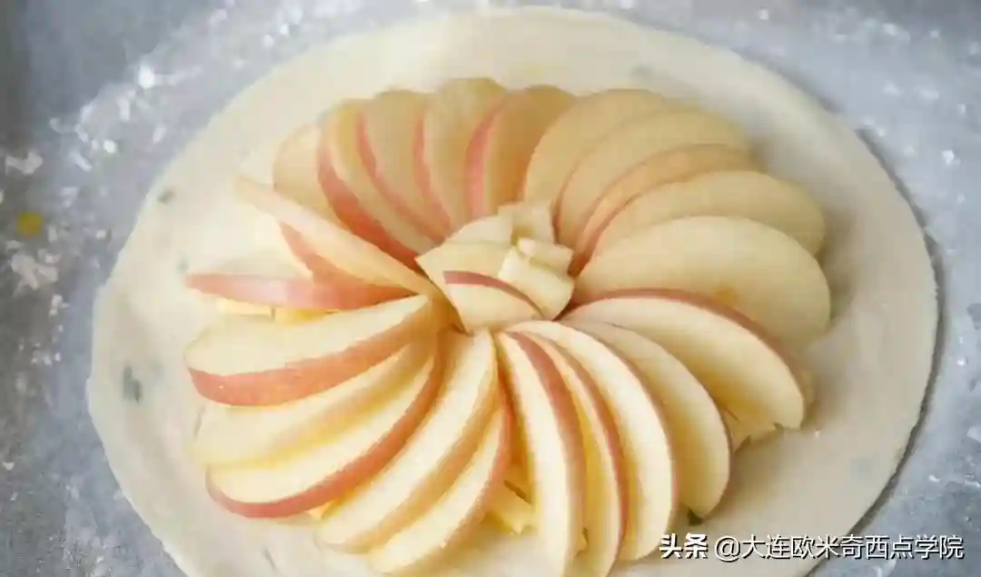 5、将苹果片呈散开状铺在饼皮奶酪丁的上方,同样预留出边缘。