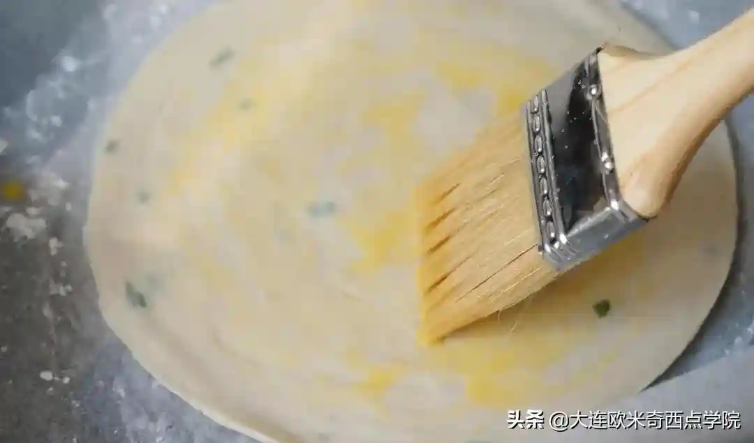 3、酥皮放在撒了少许面粉的油纸上,在表面刷上一层蛋液。