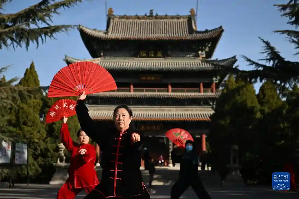 在太原市迎泽区迎泽公园,市民在练习太极扇(2023年3月1日摄)。新华社记者詹彦摄