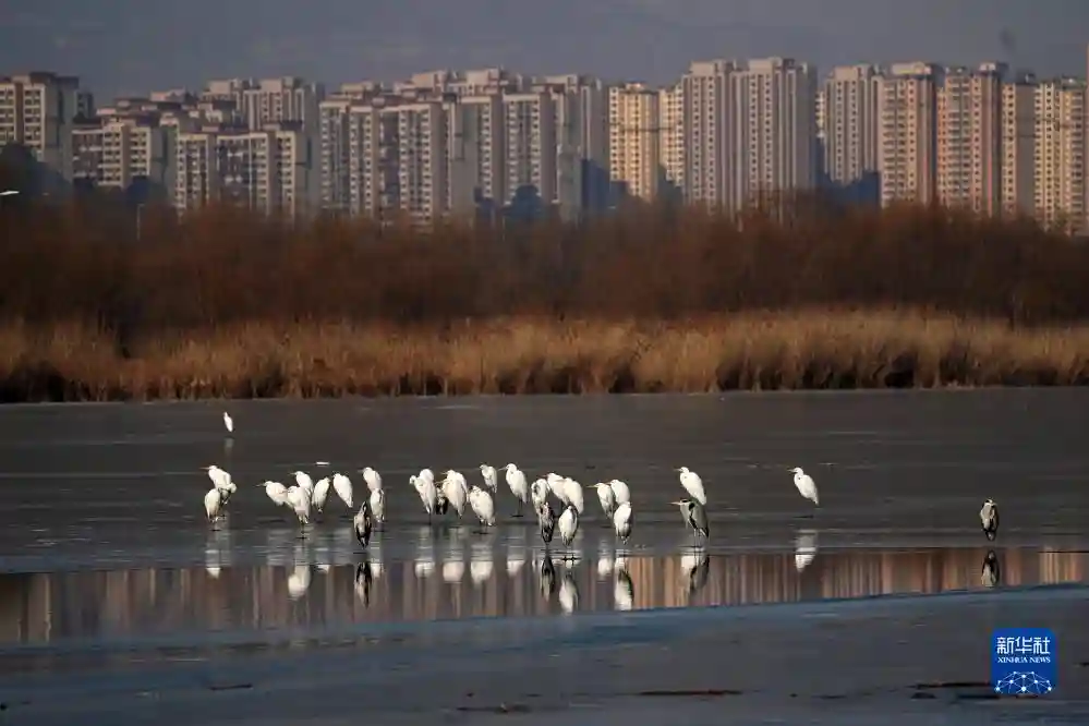 水鸟在太原市汾河栖息(2023年1月4日摄)。新华社记者詹彦摄