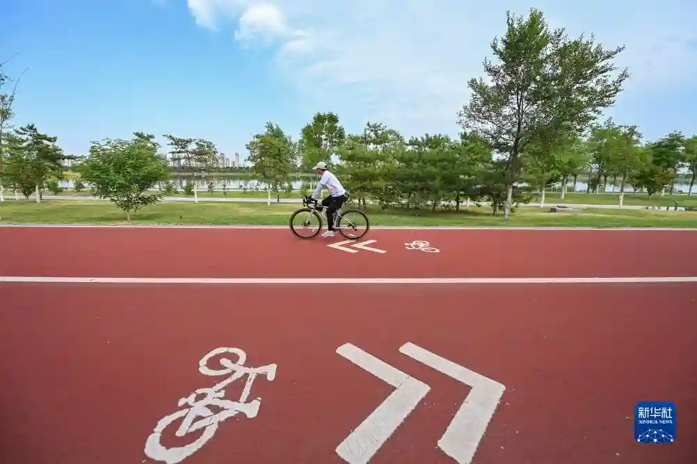 市民在太原市汾河公园内骑行(2023年6月27日)。新华社记者杨晨光摄