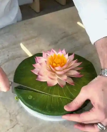 像这个Amaury超喜欢的荷花造型蛋糕,荷叶是用抹茶海绵蛋糕体做成,外表还原了植物的肌理纹路;