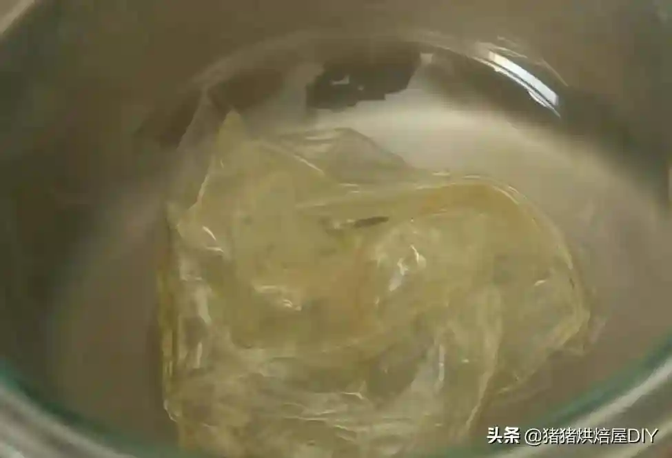 7.将吉利丁剪成小片状,尺寸以适合放在碗中为宜,用冷水加冰块软化吉利丁,也可以直接泡在冷水中,再放入冰箱冷藏室中软化。
