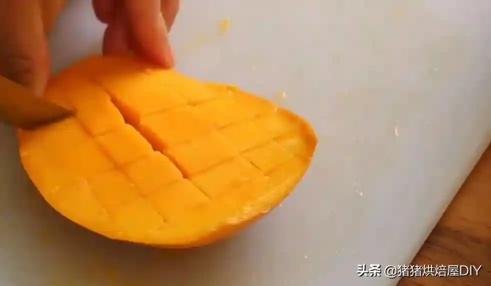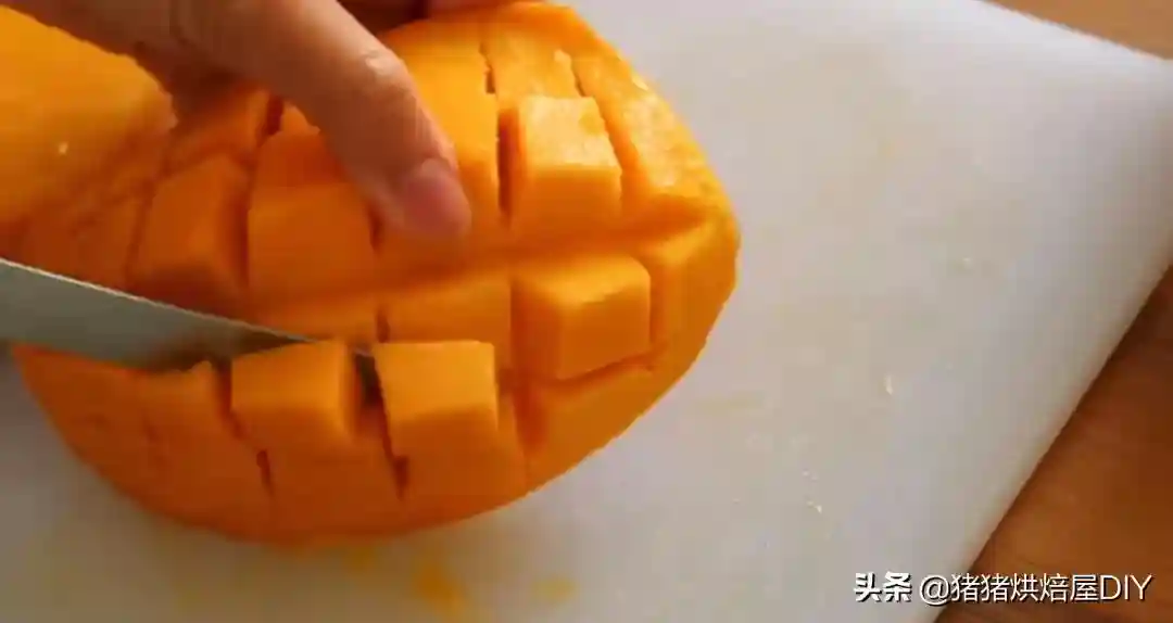 5.取出适量芒果、切丁。如下图,芒果的处理方式,是保留中间的果核,尽量切出两大片,用刀子划出十字花痕,再用刀沿着皮切掉芒果,就呈现出颗粒状了,这样的处理方式最简单,剩下的宝宝们就吃掉吧。