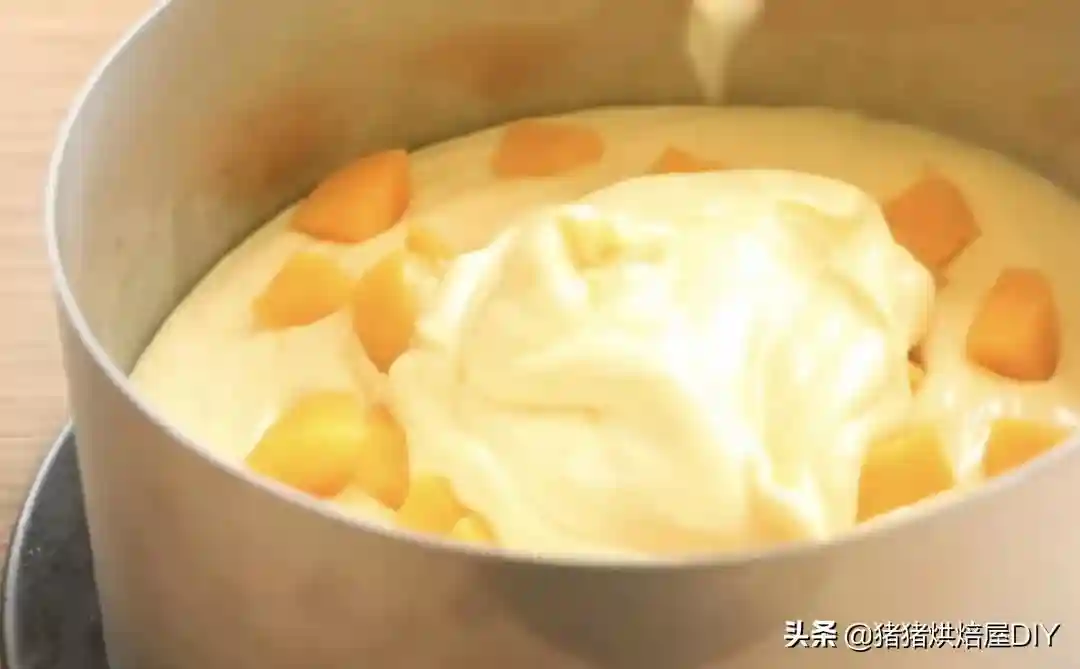 9.淡奶油加细砂糖打发好,刚刚出现纹路,大概6分发为最适合状态。打发好的淡奶油倒入刚刚做好的吉利丁果泥中,快速搅拌均匀。倒入装有饼干底的慕斯模具上面,再加一些芒果果肉。表面抹平即可。冷藏4个小时,再用热毛巾脱模。