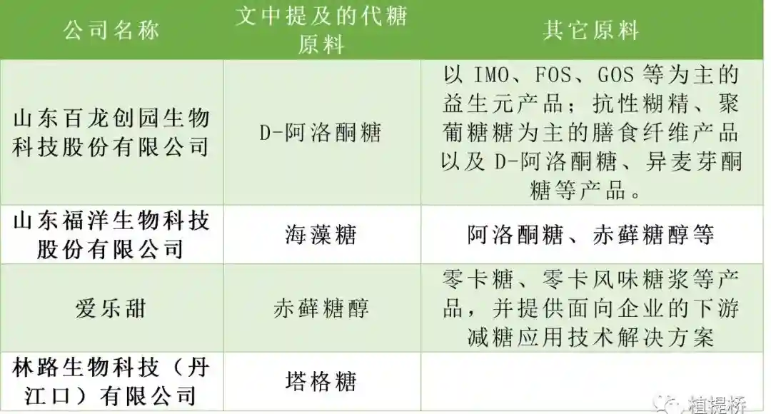 文章提及的代糖原料涉及的生产商统计(部分)