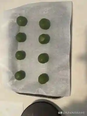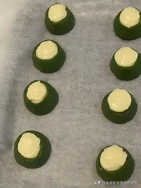 6、抹茶司康分成30克一个,搓圆用手捏出碗状,放入烤盘。