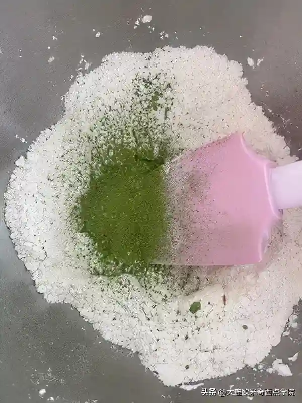 1、将低粉,糖粉,泡打粉,盐,抹茶粉一起放入打蛋盆中拌匀。