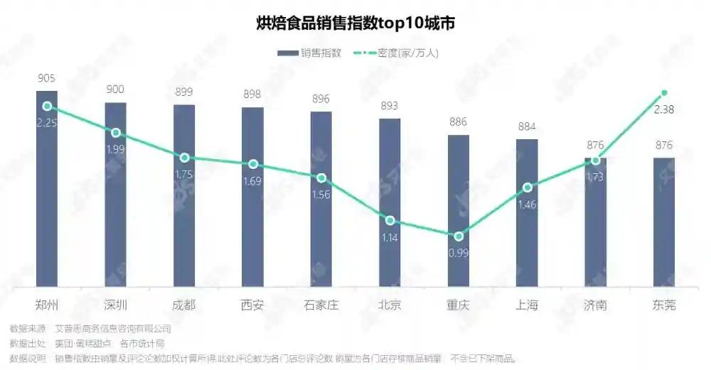 蛋糕、甜品、糕点、面包市场销量排行第一的城市分别为郑州、深圳、成都、西安。需求强劲的中式糕点销量排行前五的城市为成都、天津、郑州、上海、长沙。