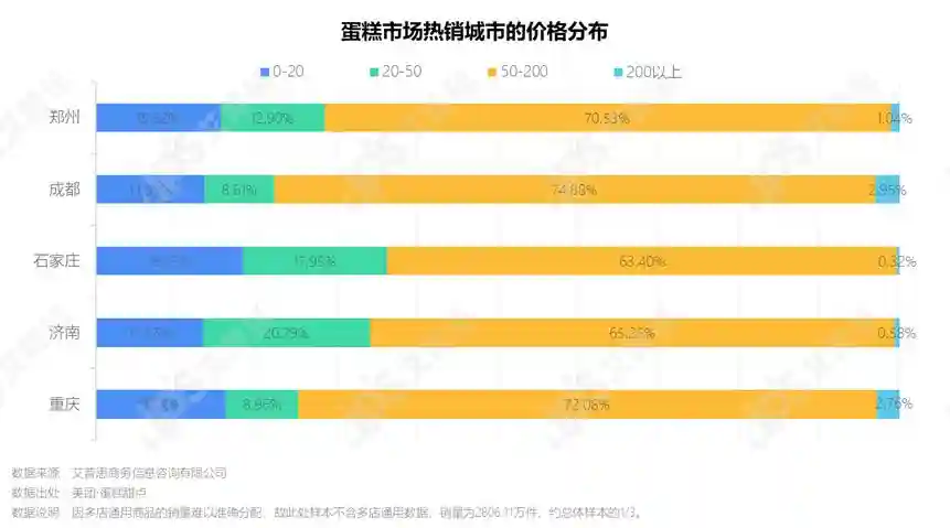 蛋糕细分市场中,相较石家庄和济南,成都、重庆、郑州三地50-200元的商品销量占比较高,而20-50元的商品销量占比较低。