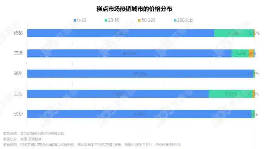 糕点细分市场中,成都和上海的消费者更能接受价格相对较高的产品,20-50元的产品销量占比均超高15%。