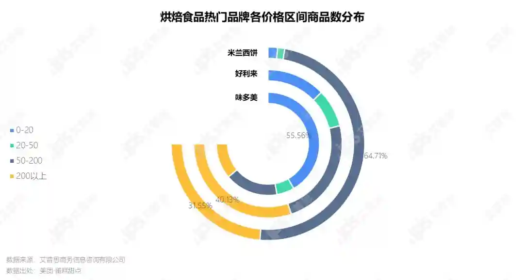 米兰西饼多人份蛋糕的商品数占比超过95%,50-200元的商品数占比超过60%,200元以上的商品数占比相对较低,为31.55%。