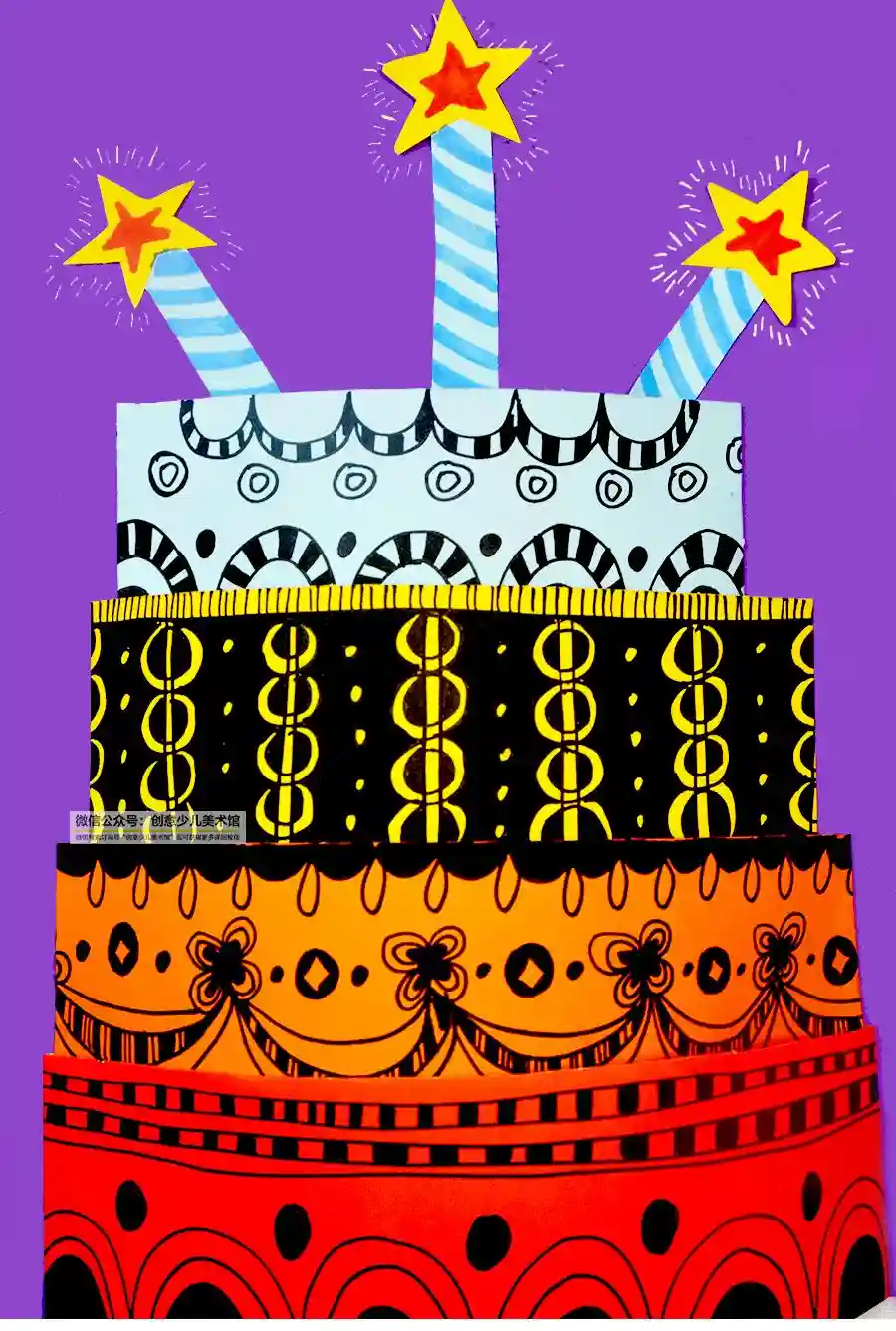 观察和欣赏生日蛋糕相关的图片素材,准备不同颜色的彩色卡纸,然后用剪贴和折纸的方式表现蛋糕的层次感和立体感,使作画过程既生动又充满趣味性。