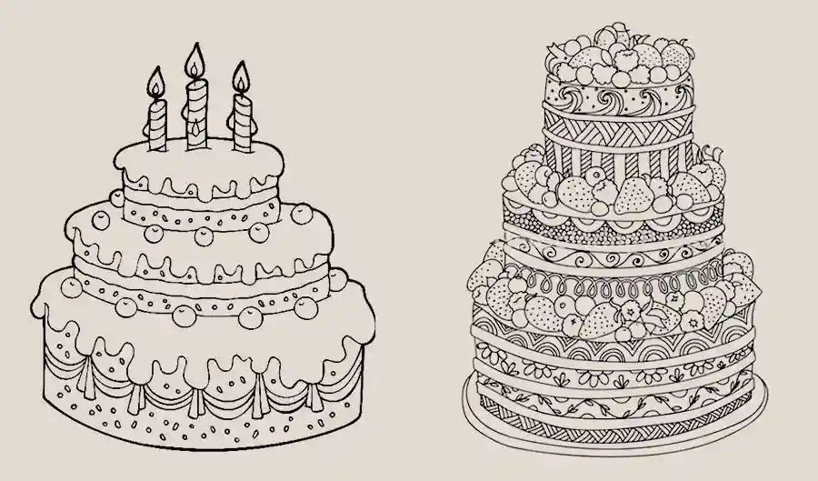 说一说生日蛋糕上都有哪些图案和装饰?展开丰富的想象,用优美富有疏密变化的线条来表现和装饰蛋糕,使画面充满疏密的变化和多样的层次,产生多样的视觉审美和享受。