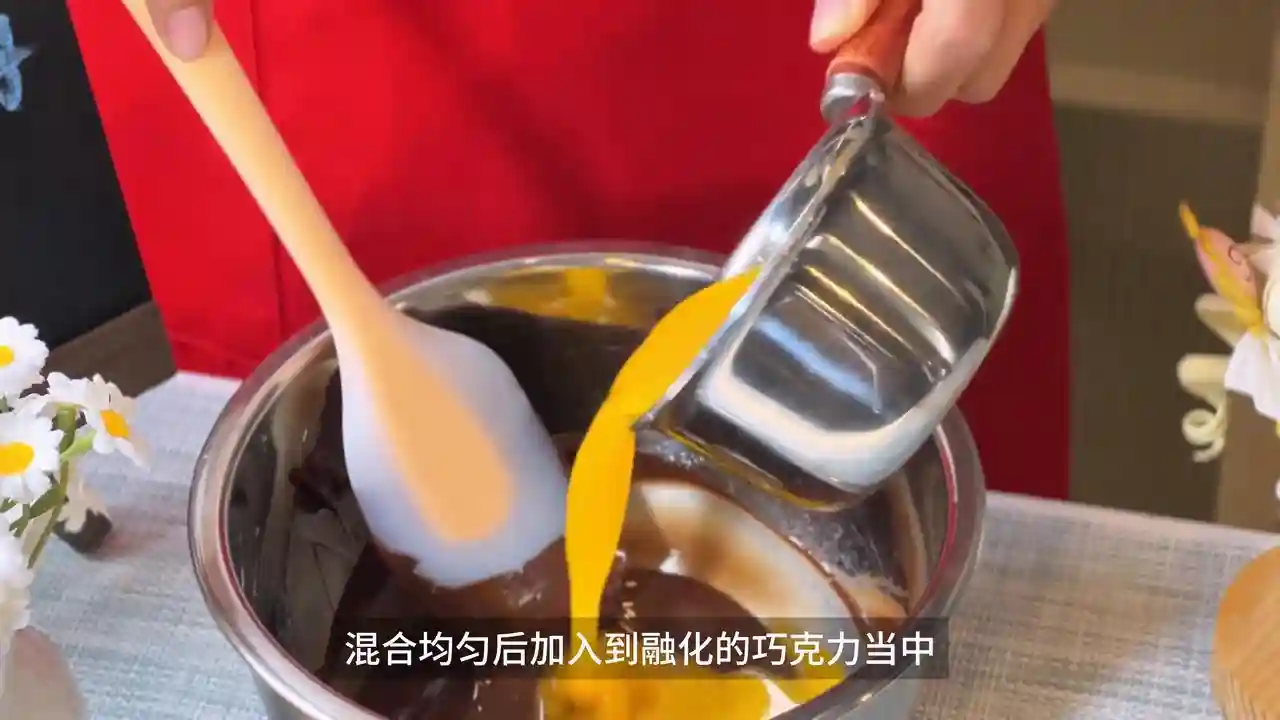 ·接下来来做巧克力百香果奶油。把吉利丁加入到热百香果果蓉中,混合均匀后加入到融化的巧克力当中,加入淡奶油给它降温。等它温度降下来之后,把奶油打发到酸奶的程度,倒入晾凉的巧克力百香果甘纳许,打发成稍微硬一点的奶油。